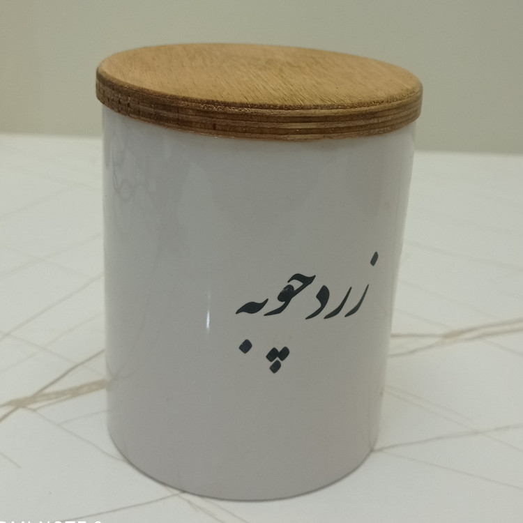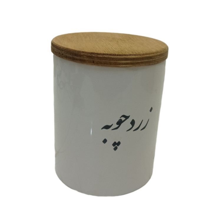 این محصول ساخته شده از سرامیک می باشد که ارتفاع این 11 سانتیمتر و قطر این کار 9 سانتیمتر درب چوبی با جنس پلی وود که کاملا ضد آب می باشد رنگ درب قهوه ای روشن نیمه براق و بدنه بانکه سفید براق می باشد