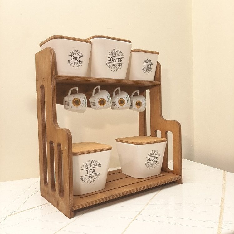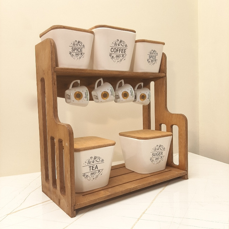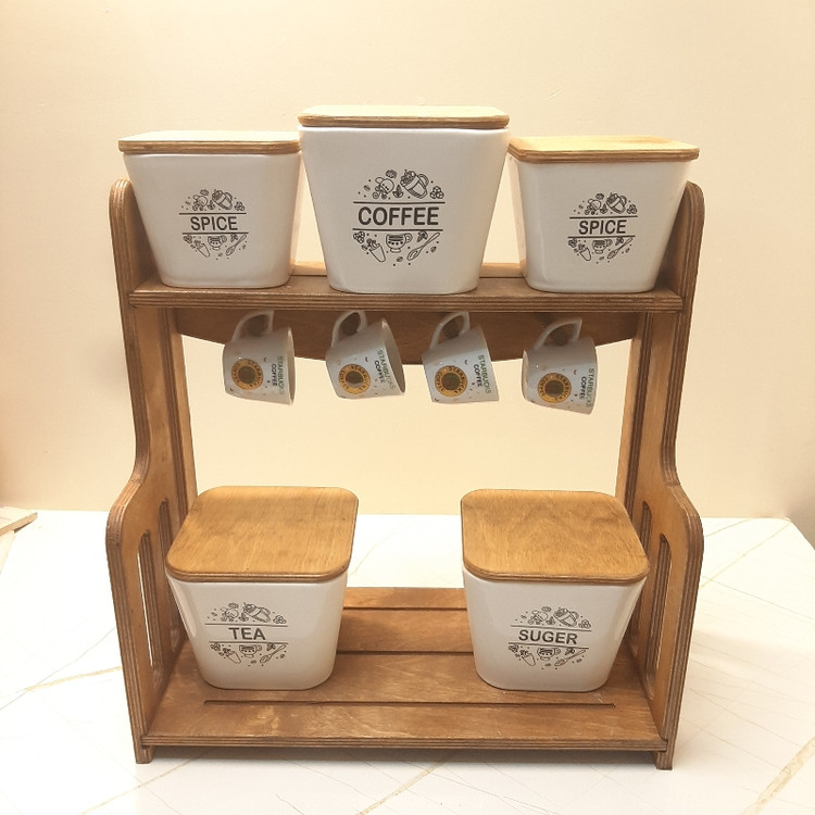 این ست تشکیل شده از 3 عدد بانکه بزرگ به سایز 15x12 و 2 عدد بانکه متوسط به سایز 12x10 با دربهای چوبی و جنس بدنه سرامیک و 4 عدد فنجان قهوه خوری جنس چینی و یک عدد استند چوبی به سایز 41x20 به ارتفاع 42 سانت
