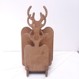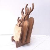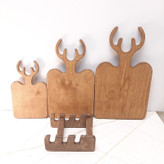 این مجموعه تشکیل شده از یک استند نگهدارنده به سایز 18x7 و 3 عدد تخته سرو چوبی شاخ گوزنی بزرگ به سایز 39x23 سایز متوسط 34x20 و سایز کوچک 25x15 که از چوب پلی وود ضد آب به ضخامت 15 میل می باشد