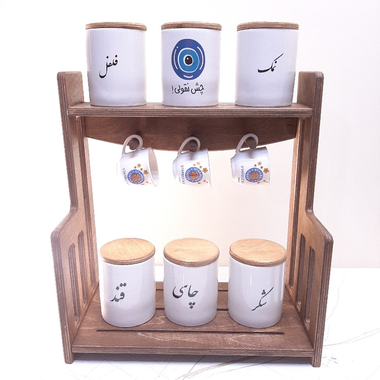این ست تشکیل شده از یک عدد پاسماوری چوبی به ضخامت 12 میل از جنس چوب پلی وود و 6 عدد بانکه چینی به سایز 9x12 با فونت فارسی با درب چوبی و 3 عدد کاپ قهوه می باشد کل این مجموعه قابل شستشو می باشد