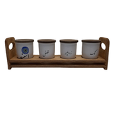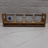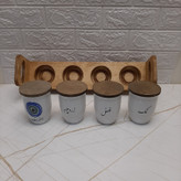 این ست تشکیل شده است از 4 عدد بانکه جذاب مدل لیوانی جدید از جنس چینی به قطر 8 سانتیمتر و ارتفاع 10 با دربهای چوبی و یک استند بسیار جذاب طراحی شده برای فقط این محصول به ابعاد 45 طول و 10 عرض و 14 سانتیمتر ارتفاع که مجموع این ست هم قابل شستشو می باشد .