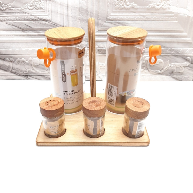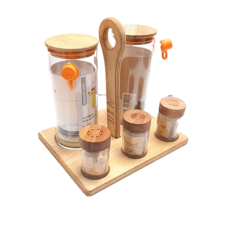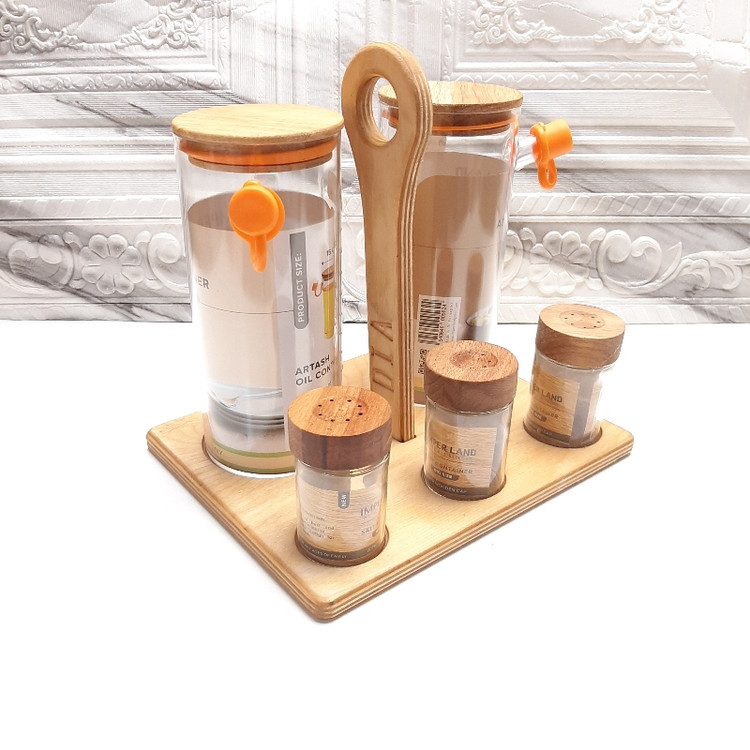 این ست تشکیل شده است از 2 عدد روغن ریز بزرگ از جنس طلق و 3 عدد نمک و فلفل پاش شیشه ای با درب چوبی از برند امپرلند و یک استند چوبی طراحی شده برای این ست که زیبایی 2 چندان به این محصول بخشیده