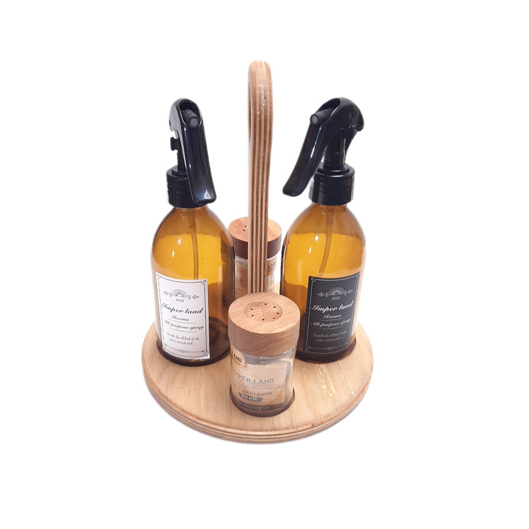 این ست تشکیل شده از 2 عدد اسپری از جنس شیشه و 2 عدد نمک و فلفل پاش از جنس شیشه و درب چوب که از جنس راش مرغوب که با بسته شدن کاملا کیپ میشود و یک استند نگهدارنده این مجموعه از جنس چوب که بسیار کار آمد می باشد