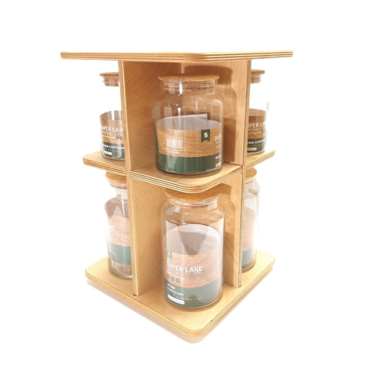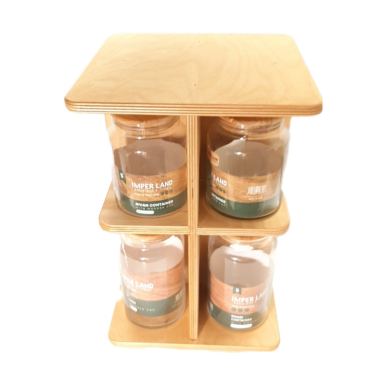 این ست تشکیل شده است از 4 عدد بانکه بی رنگ سایز متوسط و 4 عدد بانکه سایز بزرگ که همه از جنس شیشه از شرکت امپرلند و دارای واشر می باشد استند این مجموعه طراحی و ساخت دیا چوب که کاملا ضد آب بوده و طراحی این استند به نحوی هست که برای دسترسی هر چه آسانتر دارای سیستم چرخش 360 درجه می باشد