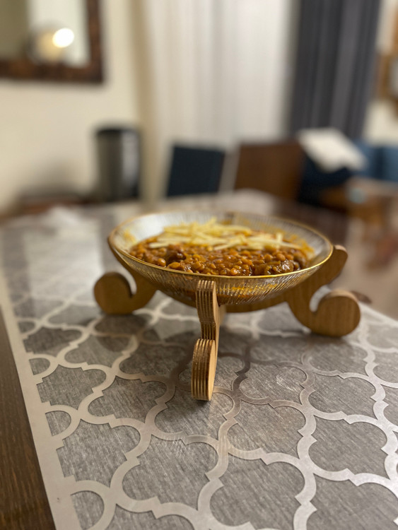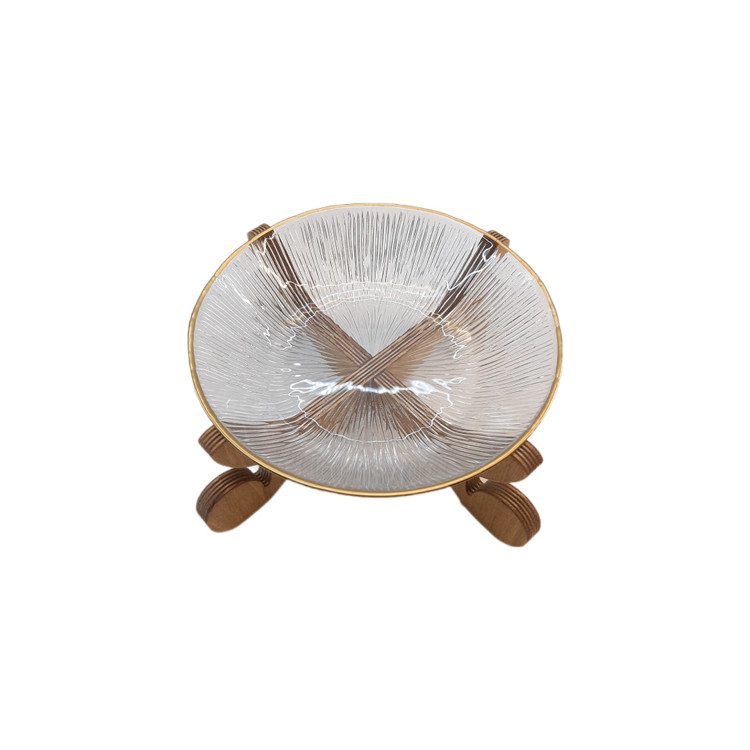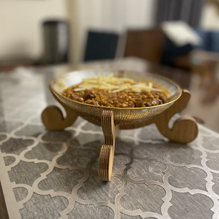 این محصول با طراحی زیبا و کار آمد برای سرو انواع خورش مناسب می باشد جنس کاسه از شیشه تولید شرکت نوری تازه و پایه مستحکم از جنس چوب پلی وود با رنگ قهوه ای روشن مات می باشد لازم به ذکر است که رنگ کاسه سفید و لبه کار طلایی می باشد