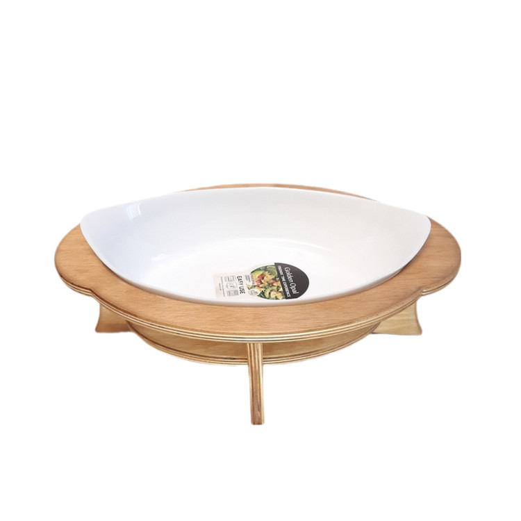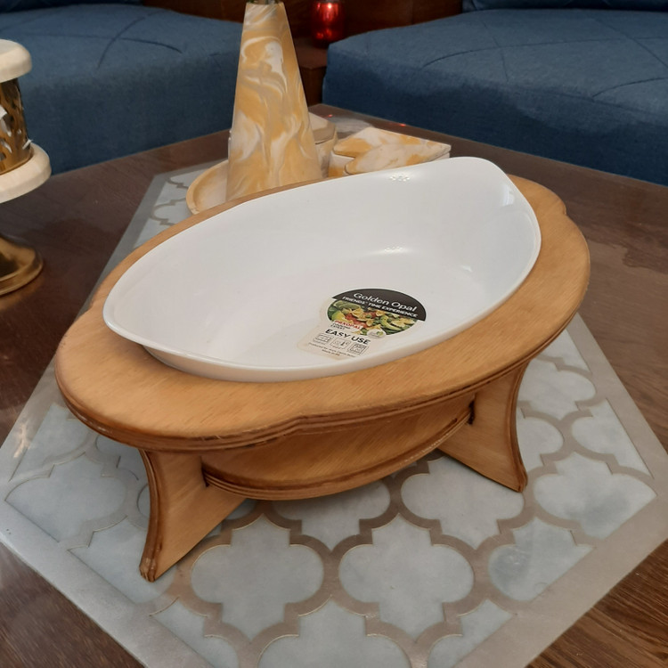 این مجموعه تشکیل شده است از یک عدد ظرف از جنس آرکوپال که قابل استفاده در فر و ماکروویو با طول ۳۰ و عرض ۱۸ سانتیمتر برای پخت و سرو انواع غذا مناسب می باشد پایه این کار از جنس چوب مستحکم پلی وود که زیبایی ۲ چندانی به این مجموعه بخشیده .