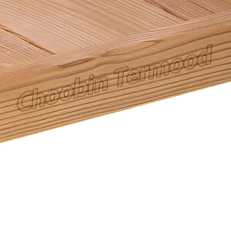 چگونه فرآوری ترمووود انجام می شود؟ چوب تا دمای 220 درجه سانتی گراد حرارت می بیند به طوری که قبل از رسیدن به مرحله ی سوختن، افزایش دما پایان می یابد. افزایش دما، ساختار شیمیایی چوب را تغییر می دهد و در نتیجه خواص آن نیز تغییر می یابد. تغییرات خواص چوب منجر به افزایش مقاومت و استحکام چوب و همچنین افزایش خاصیت عایقی چوب می شود. فرآوری ترموود منجر به تغییر رنگ چوب می شود و آن را به رنگ قهوه ای تیره مبدل می سازد. برخی از ویژگیهای چوب ترموود: -دوام بالا و ثبات ابعاد : پس از تيمار حرارتي (فرآیند ترمو)، درصد رطوبت چوب به %6-4 كاهش يافته و چوب داراي ويژگي به نام ( تعادل رطوبتي ) مي گردد كه در نتيجه جذب رطوبت و تبادل حرارت چوب و محيط اطراف در آن به شكل قابل توجهي كاهش مي یابد كه اين امر تأثير خاصي در ثبات ابعاد، كاهش ترك خوردگي و افزايش قابل ملاحظه خواص عايق بودن الوارهای چوب ترمو (ترمووود) ايجاد مي نمايد. -مقاوم در برابر پوسيدگي و حمله حشرات : به دليل شكستن و تجزيه همي سلولزها ( زنجيره قندي ) در چوب ترمو شده باكيفيت عالي، اين محصولات منبع مغذي براي حشرات و قارچ هاي مولد پوسيدگي چوب نخواهند بود. -فاقد صمغ، خلوص و يكنواختي : هنگامي كه الوارهاي چوبي تحت عمل آوري ترمو قرارمي گيرند، رزين ومواد مضر آن مانند فرمالدهيدها حذف مي گردند باكتري ها كشته مي شوند و سبب توليد ماده اي خالص و استريل براي كاربردهاي مختلف بيروني و داخلي مي گردند. با ايجاد رنگي يكنواخت در سراسر الوار چوب زيبايي خاصي به آن نیز مي بخشد. این علامت اختصاری ثبت شده انجمن ترموود فنلاند و هم چنین نماد کنترل کیفیت برای انواع چوب های ترمو یا ترمووود یا ترموود می باشد.