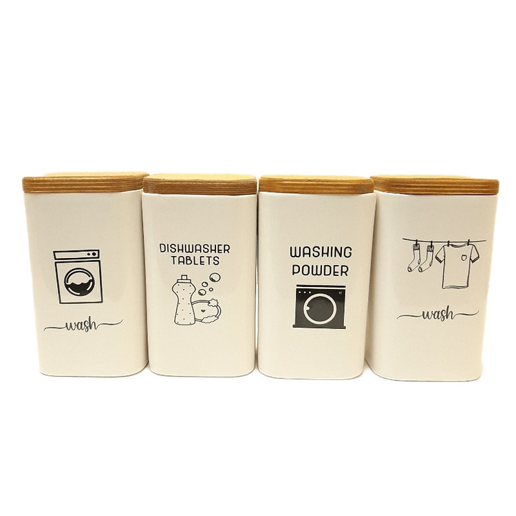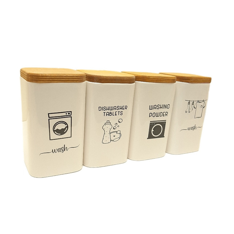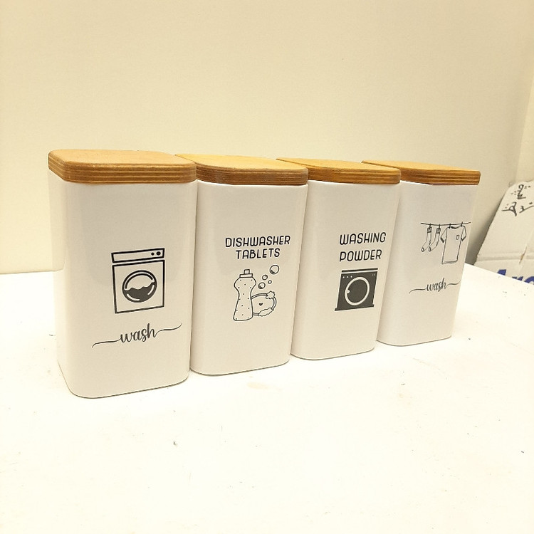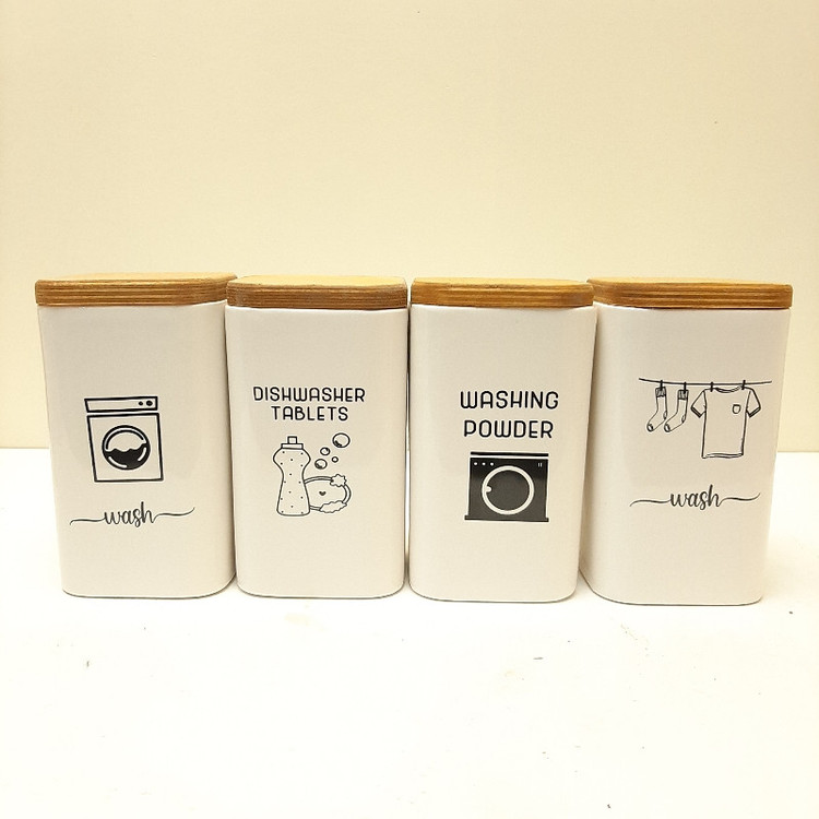 این ست جای پودر لباسشویی و ظرف شوری سرامیکی تشکیل شده است از 4 عدد بانکه سرامیکی به ارتفاع 14 سانتیمتر و قطر 10 سانتیمتر با درب چوبی به ضخامت 15 میلمتر نکته پر اهمیت کل این ست قابل شستشو می باشد