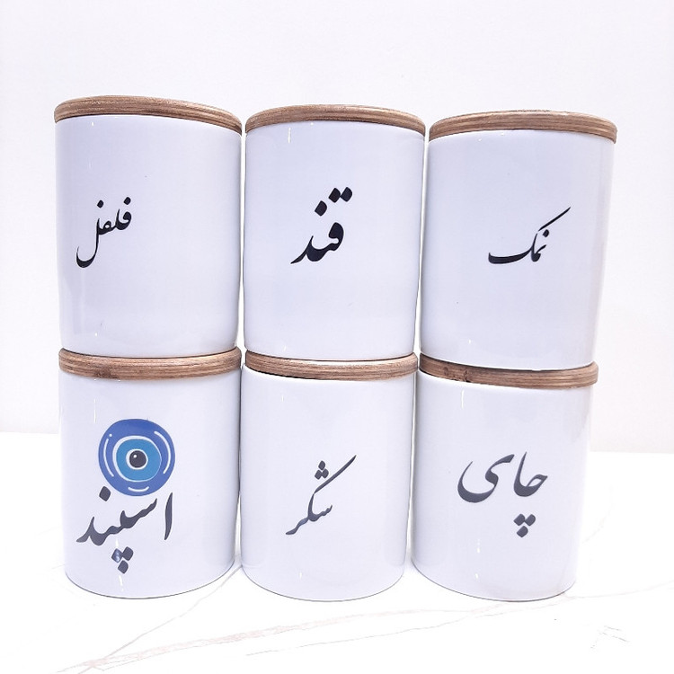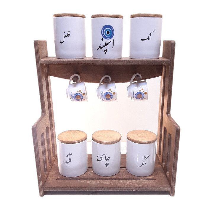 این ست تشکیل شده از یک عدد پاسماوری چوبی به ضخامت 12 میل از جنس چوب پلی وود و 6 عدد بانکه چینی به سایز 9x12 با فونت فارسی با درب چوبی و 3 عدد کاپ قهوه می باشد کل این مجموعه قابل شستشو می باشد