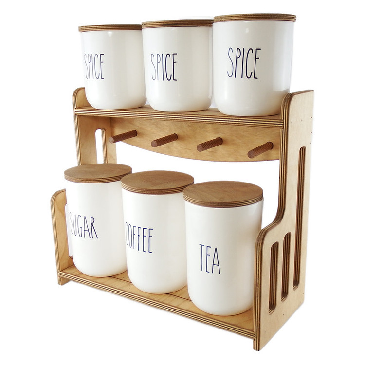 این ست جا ادویه تشکیل شده است از 6 عدد بانکه ( بدون واشر ) با قطر 11 سانتیمتر که 3 عدد آن به ارتفاع 17 سانتیمتر و 3 عدد آن به ارتفاع 13 سانتیمتر که دارای یک استند و دربهای چوبی از جنس پلی وود ضد آب با طراحی منحضر به فرد که هر بانکه در جایگاه خود قرار می گیرد